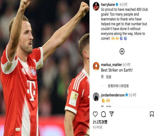 雷速体育10月19日宣 德甲第7轮比赛,拜仁2-1击败多特蒙德,凯恩打入了个人俱乐部生涯的第400球。赛后,凯恩更新个人社媒,谈到了400球的感受。