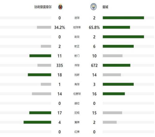 第29分钟比利亚雷亚尔在右路策动进攻,盖伊内切后的重炮轰门稍稍偏出,半场比赛结束之前,曼城扩大领先优势,萨维尼奥带球杀入禁区后,牵制了三名防守球员,随后挑传中路,门前包抄的B席头槌建功,帮助曼城带着2球领先,回到了中场更衣室。