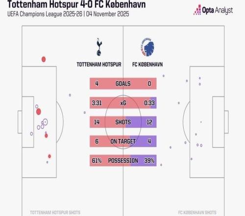 北京时间11月5日欧洲冠军联赛,联赛阶段第4轮,热刺主场4-0击败哥本哈根,热刺的预期进球高达3.31。上一场主场对阵切尔西,热刺全场仅完成三次射门,预期进球值(xG)仅为0.05,这是自2012-
