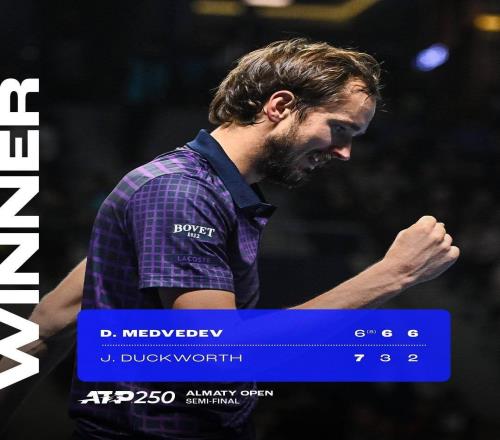 就在刚刚,ATP250阿拉木图站首场男单半决赛结束了最后的争夺,2号种子梅德韦杰夫经过三盘激战,最终以6-7(8)6-3 6-2逆转从资格赛突围的澳大利亚黑马球员达克沃斯,职业生涯第40次闯入